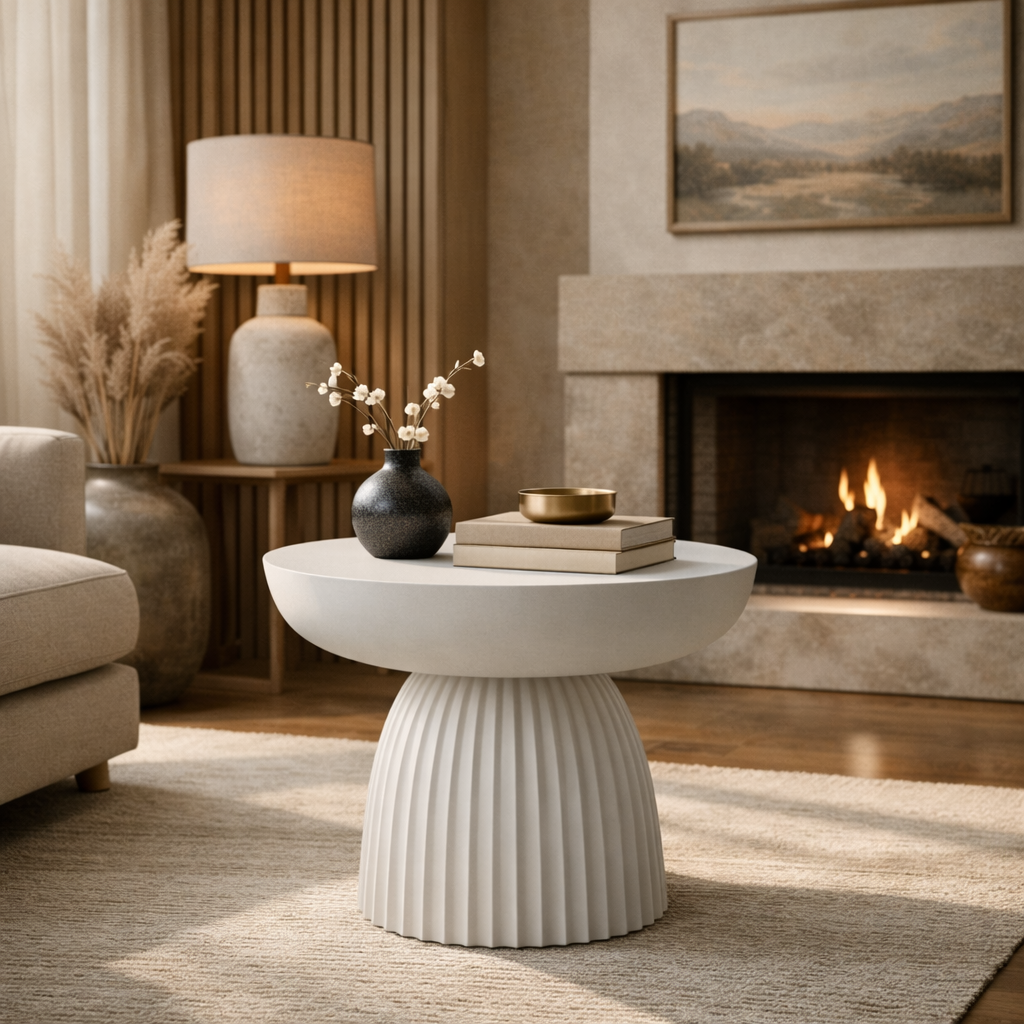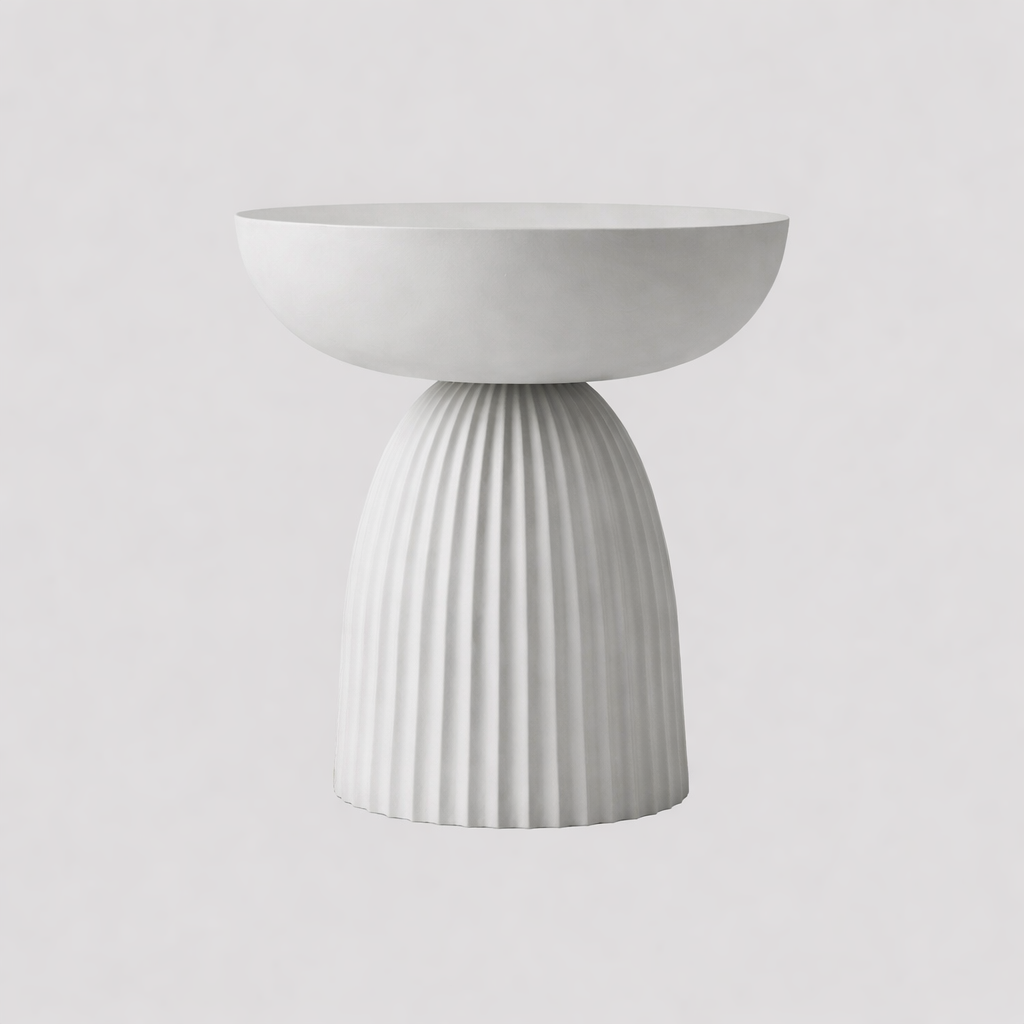 Dieser moderne Beistelltisch aus hochwertiger Keramik überzeugt durch sein minimalistisches Design und eine elegante, geriffelte Säulenbasis. Die matte weiße Oberfläche fügt sich harmonisch in verschiedene Wohnstile ein – von modern über skandinavisch bis hin zu minimalistisch.